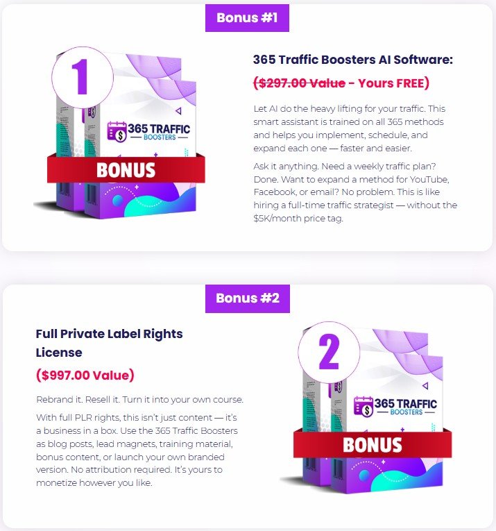 A: 365 Traffic Boosters is for anyone who wants to drive more traffic to their website, offers, and funnels without spending a fortune on advertising. It’s perfect for newbies and seasoned marketers alike.