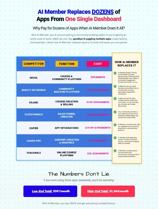One-Time Payment, No Monthly Fees – Unlike platforms like Kajabi or Skool, AI Member provides unlimited access with a single purchase.
