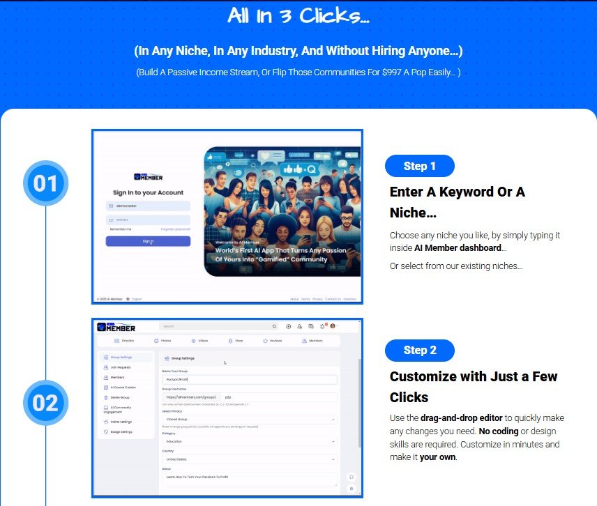 Modern digital society relies on communities to create engagement along with trust and generates profits as its main outcome. This AI platform enables anyone to establish communities and grow them to profitability at no effort. AI Member offers exactly these operational abilities.