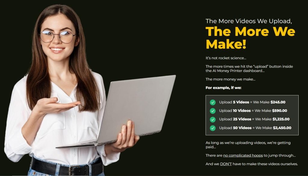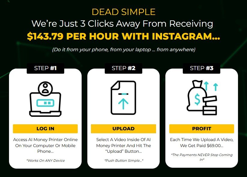 According to the AI Money Printer system one does not need to perform traffic driving or product selling to make money online. This system supposedly generates payments for users who do not need to do extra marketing or selling tasks.