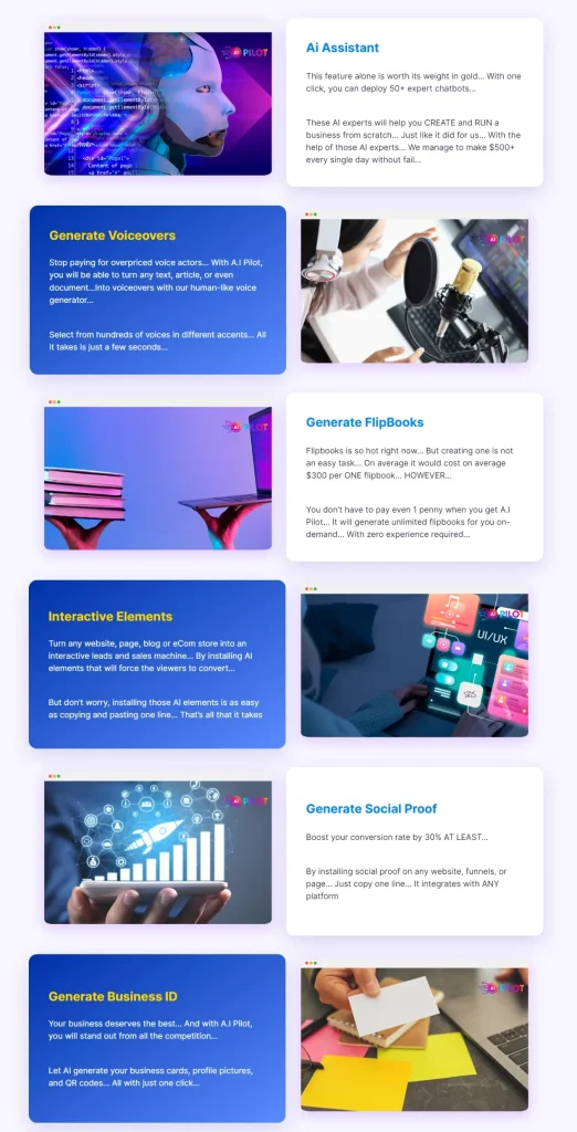 To sum up, AI Pilot is a ground-breaking AI-powered tool that has the potential to significantly improve your company and increase your revenue. AI Pilot is the real deal, delivering over 85 AI capabilities that can develop websites, generate content, design images, and even code software, in contrast to other AI products available on the market. You may use professional chatbots in any niche and have them do all of the work for you with a few clicks. AI Pilot offers the resources you need to be successful whether you run a local business, blog, e-commerce store, or affiliate marketing. You have nothing to lose with a 30-day money-back guarantee. Don’t pass up this chance to unleash AI’s full potential and grow your company to new heights.