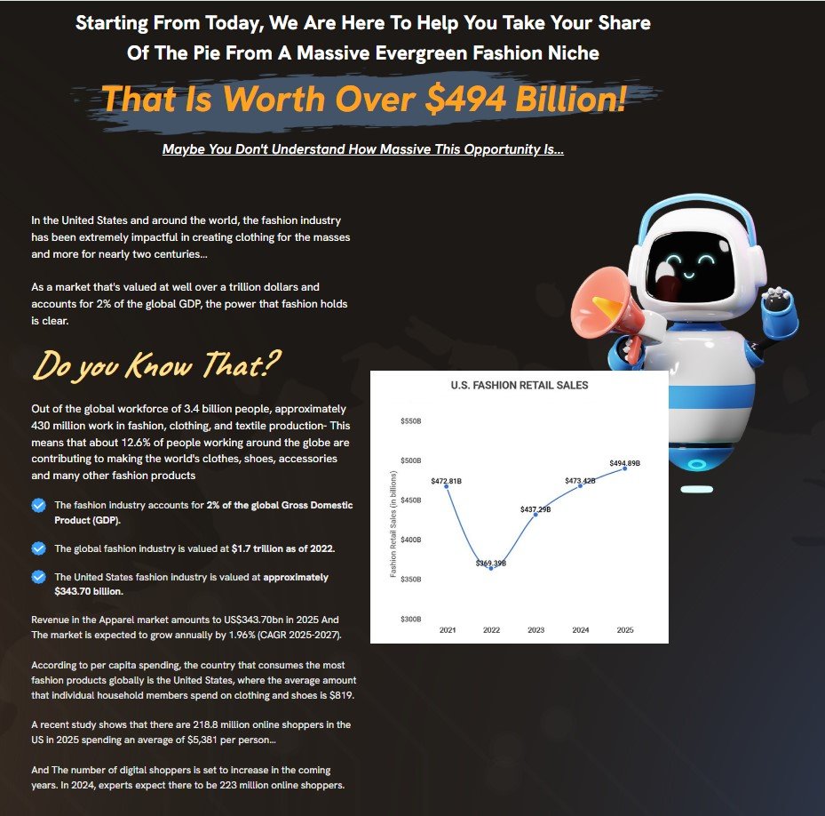 The combination of AI automation together with free traffic tools and 2 million best-selling fashion products in AI ShopApp creates a safe path to profit from the $494 billion fashion industry markets.