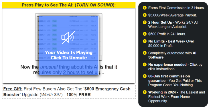 Auto-Affiliate AI is an AI-driven solution that claims to produce big affiliate commissions with little work. It boasts advantages like a 2-hour setup process, an average weekly payout of $5,000, and the ability to earn the first commission in 3 hours or less.
