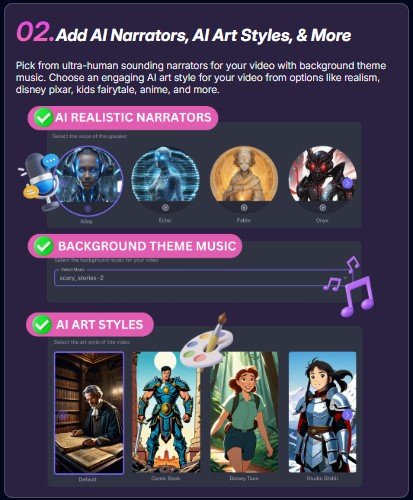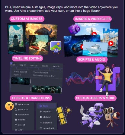 The application functions across YouTube and TikTok platforms as well as Facebook and Instagram. The application generates video content using its features for stories combined with voiceovers and artistic elements and Search Engine Optimization attributes. The application can schedule automated video publication.