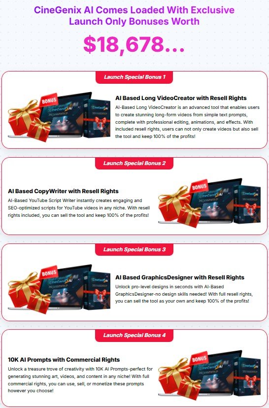 For a limited time, CineGenix AI comes with premium bonuses to enhance your video creation and marketing capabilities.