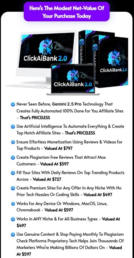 ClickAiBank 2.0 is designed to build affiliate sites that use artificial intelligence. With Gemini 2.5 Pro, it creates full affiliate websites that are ready to use on ClickBank, WarriorPlus and JVZoo.