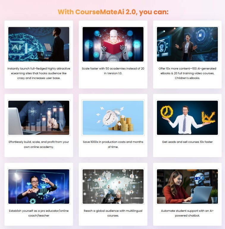 Imagine creating your personal online learning platform with a few steps; you can do it easily. No coding. No design skills. No content creation. Allow the technology to do the whole process with precision. That’s what CourseMateAi 2.0 promises. And yes, it really delivers.
