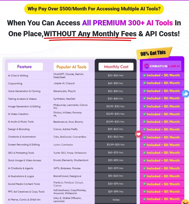 Are you not satisfied with paying $500+ every month for different AI tools? Say goodbye to endless subscriptions. The game is being changed with Creative Lab AI.