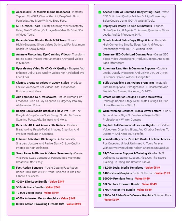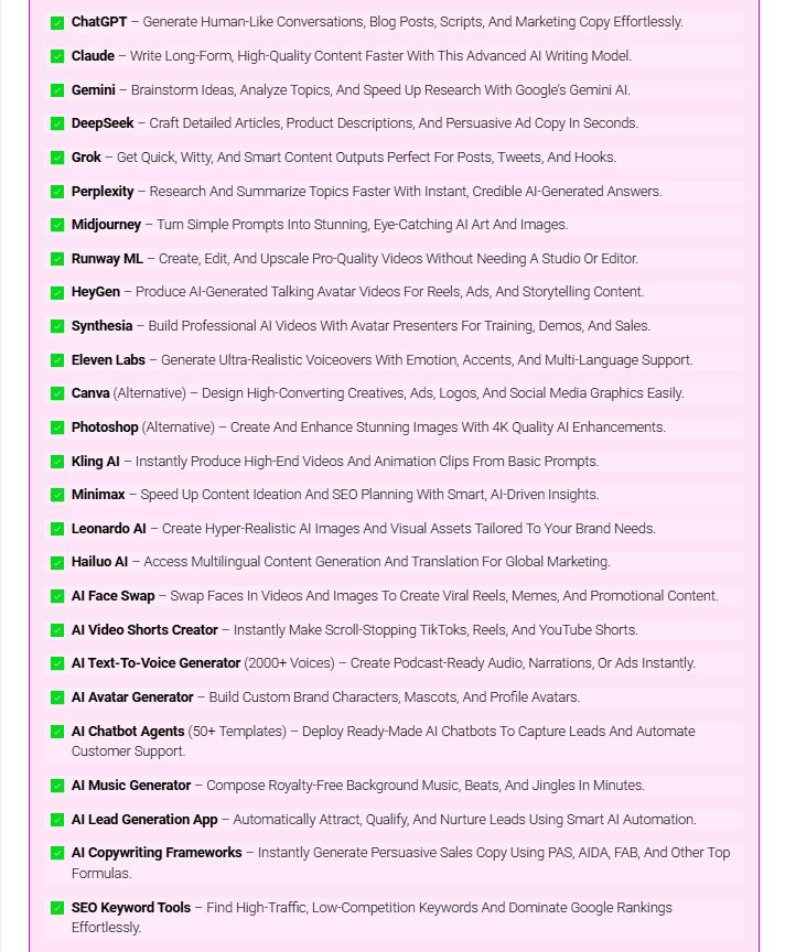 Instead of buying separate tools like ChatGPT, Canva, Midjourney, etc., this platform covers them all.