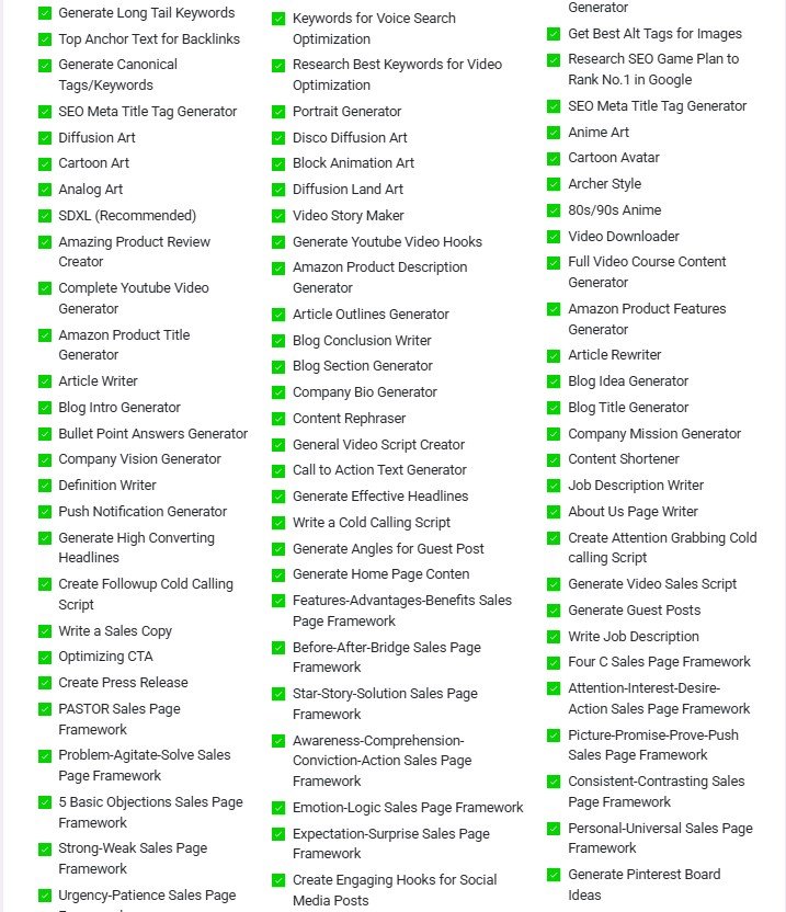 Generate blog posts, sales pages, product descriptions, and more. It includes 150+ AI writing tools.