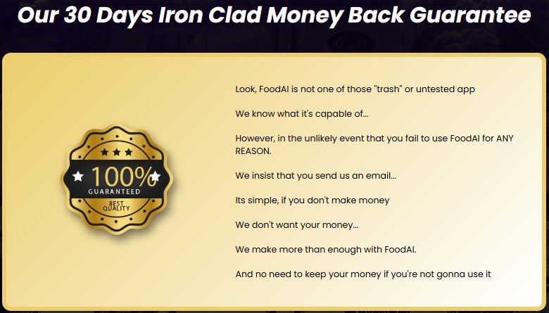 While that is unlikely, we removed all the risk for you. If you tried FoodAI and failed, we will refund you every cent you paid And send you $300 on top of that just to apologize for wasting your time.