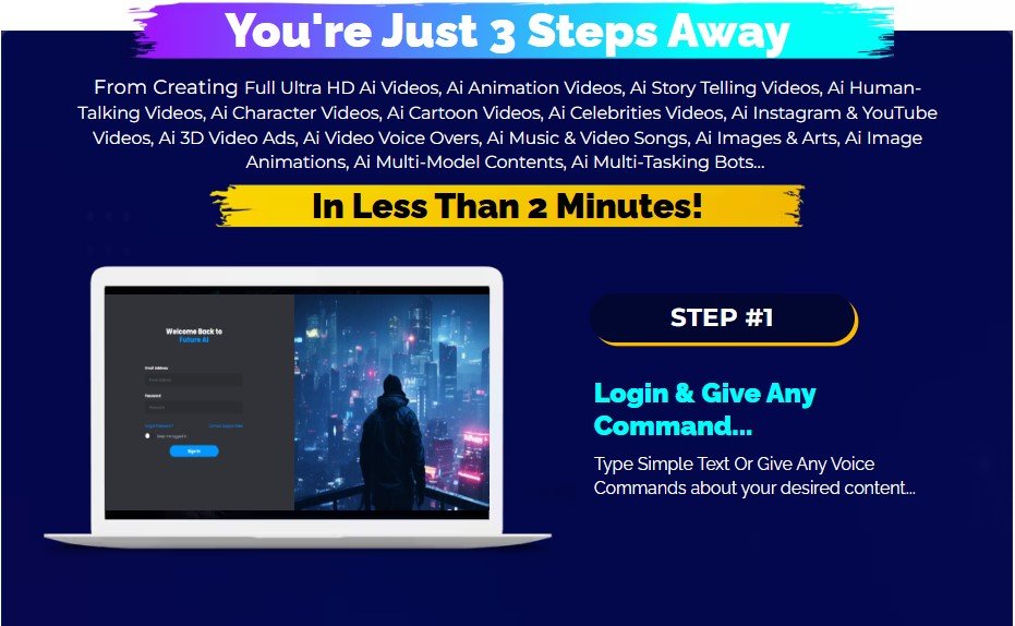 Creating content requires the least amount of effort ever. FutureAI represents an intelligent application that employs AI technology to generate videos along with music and designs and voiceovers.