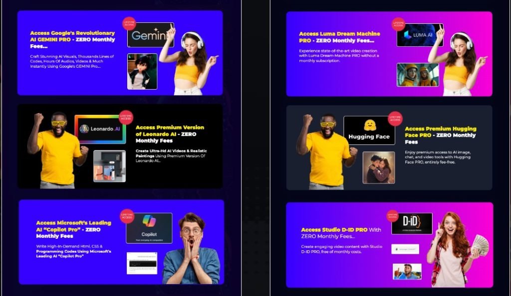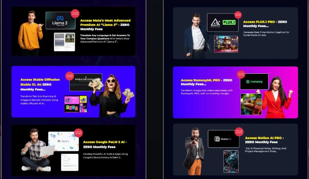 - Access 8 premium AI tools: ChatGPT 4.0, DALL·E 3, Leonardo AI, Meta Llama 3, and others.