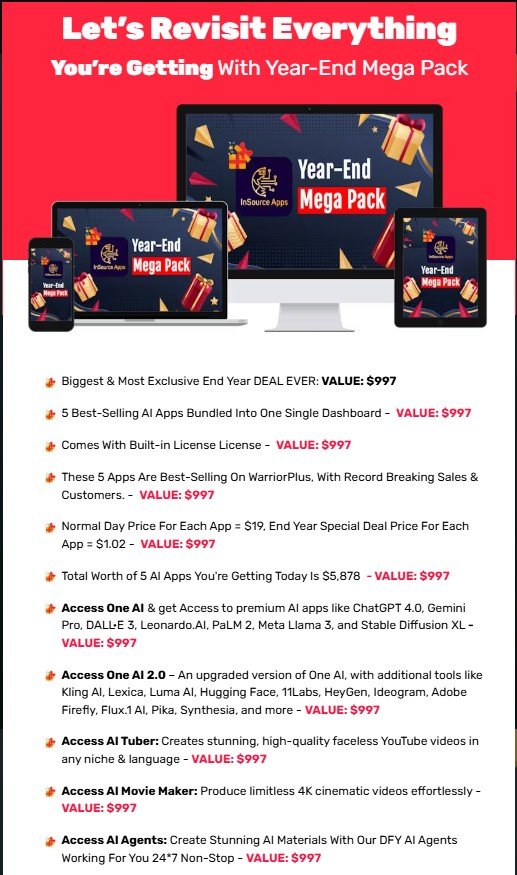 The year is coming to a close, and with it comes the biggest and most exclusive deal from InsourceApps: the Year-End Mega Pack. If you are eager to embrace the future with strategic advantage toward 2025, this mega special collection compiles five of their top-selling and most powerful AI apps into one easy-to-use platform for just a fraction of the cost in discounted one-time Only. Now let’s take a deeper look at why this is a must-cash and how this strategy can transform your AI initiatives.