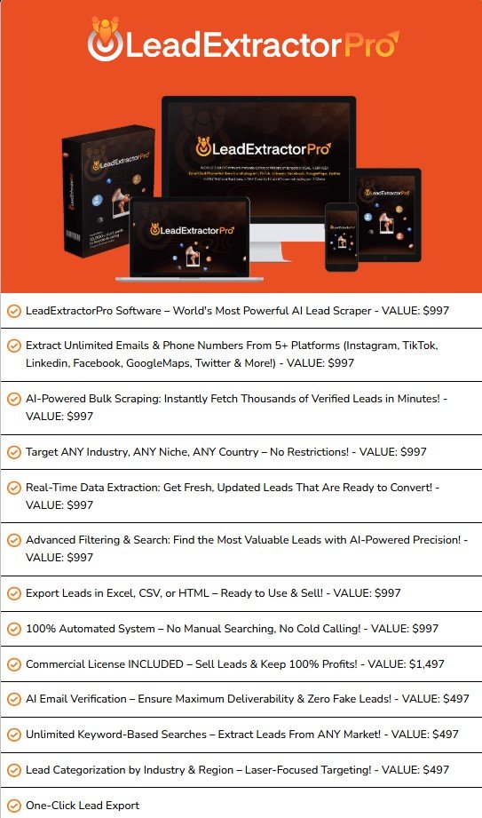 LeadExtractorPro is an Al-powered lead generation software that automatically extracts verified emails, phone numbers, and business details from Instagram, TikTak, Linkedin, Facebook, GoogleMaps, Twitter and more. It’s designed to help businesses, marketers, and entrepreneurs get high- quality leads in minutes without manual work or expensive agencies.