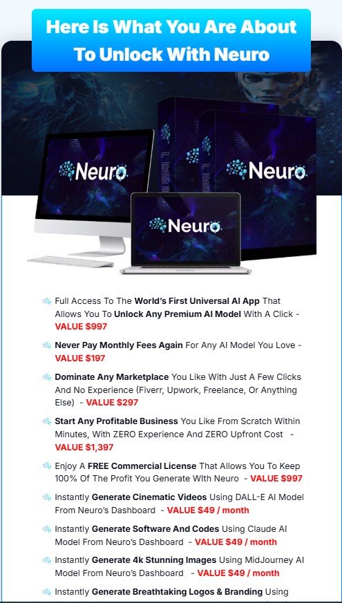 Today AI is rapidly developing and the ability to work with new tools and technologies becomes not only a competitive advantage but a necessity. Meet Neuro, the next level AI app solution that will revolutionize the industry by providing access to over 90 high-quality AI models all rolled into one neat package. Neuro provides the tools for making websites, watching them, making powerful videos, designing logos, and scheduling the work – all with no monthly fees and tricky connections.