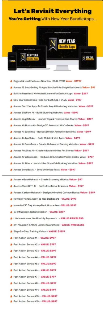 NY BundleApps is a limited offer application package that comprises 12 top-selling applications that use Artificial Intelligence to revolutionize your marketing, content, website, and other aspects of your online presence. This enormous, revolutionary bundle is the ultimate January sale of the 2025, providing access to these effective tools for $14.95 instead of $11,997 of the initial value of these tools.