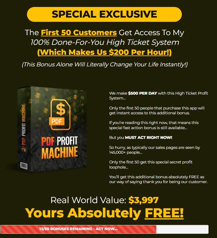 The process of generating income by uploading PDF files has the potential to become reality through PDF PROFIT MACHINE. The opportunity sounds unbelievable because it cannot seem authentic. PDF PROFIT MACHINE enables users to transform their dreams about online PDF earnings into actual reality. Users need only to upload PDF files using this AI system which promises continuous payment of $49 without the need for selling or technical know-how or website traffic.