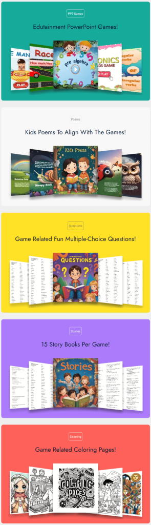 You’re getting access to: 15+ games, with additional assets to help you! Poems and fun multiple-choice questions, 150+ storybooks, and coloring pages
