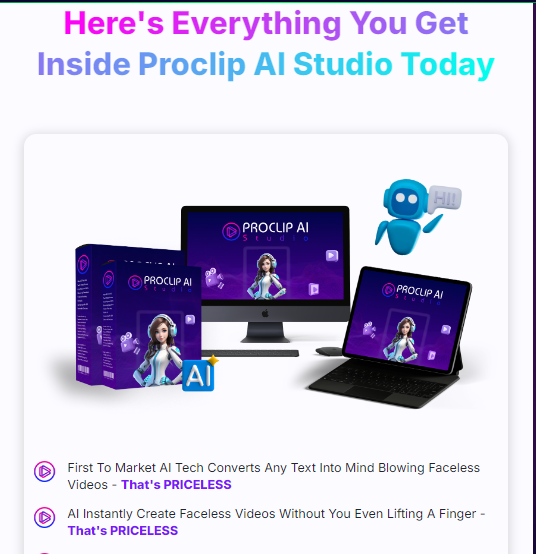 You will get a complete package that will improve your ability to create videos and organise your marketing when you buy Proclip AI Studio. Below is a thorough explanation of what is contained: