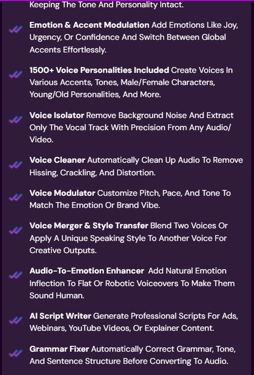 You can create personalized voiceovers, podcast intros, YouTube narration, sales videos, training audio, audiobooks, dubbed videos, reels, and much more — all sounding natural and professional.