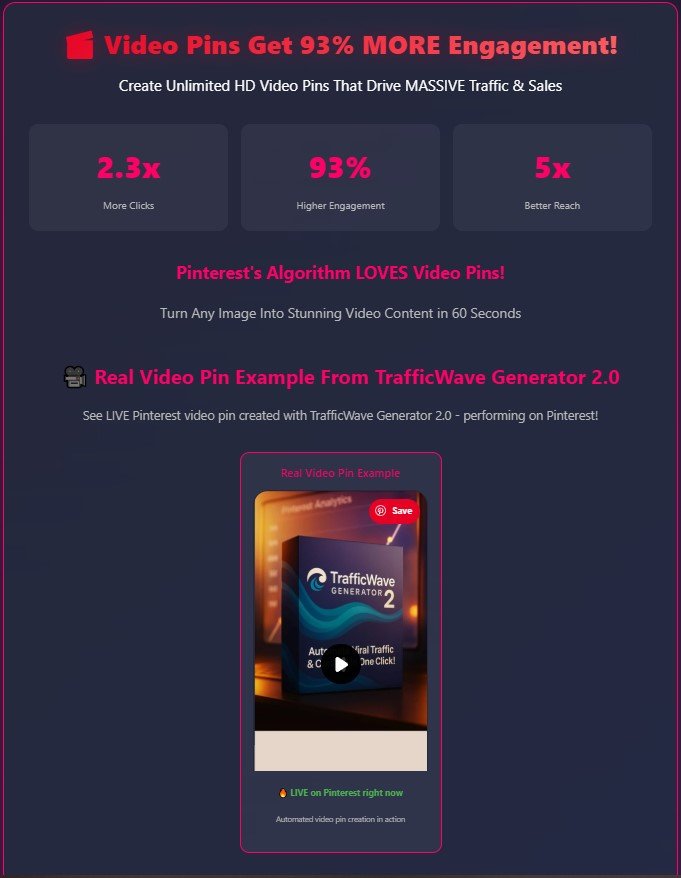 Video pins drive more engagement on Pinterest. TrafficWave Generator 2.0 creates beautiful, scroll-stopping video pins without requiring you to record or edit anything.