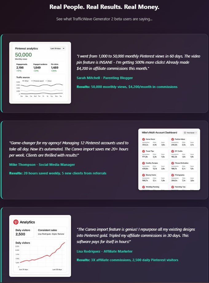 “I got over 1,200 daily visitors in under three weeks with TrafficWave 2.0. Best investment this year!”
