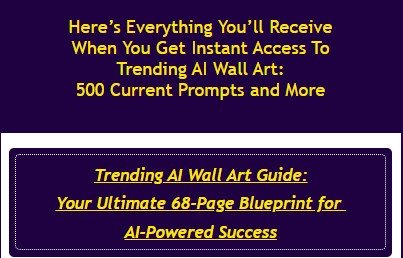 Trending AI Wall Art is a complete toolkit designed to help you create and sell stunning, in-demand wall art using the power of AI. It includes 500 expertly crafted prompts, the ultimate guide on Art market trends, workflow videos, and additional resources like commercial-use designs and print-on-demand strategies.