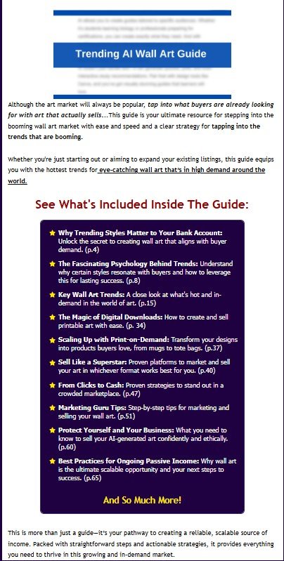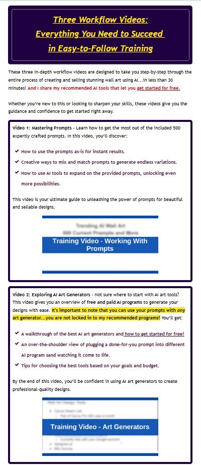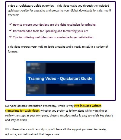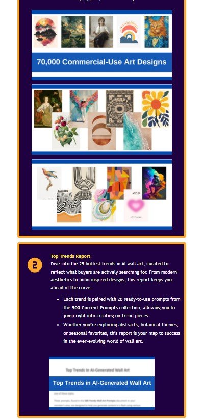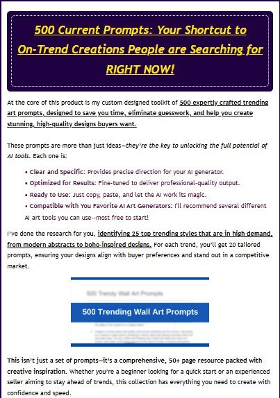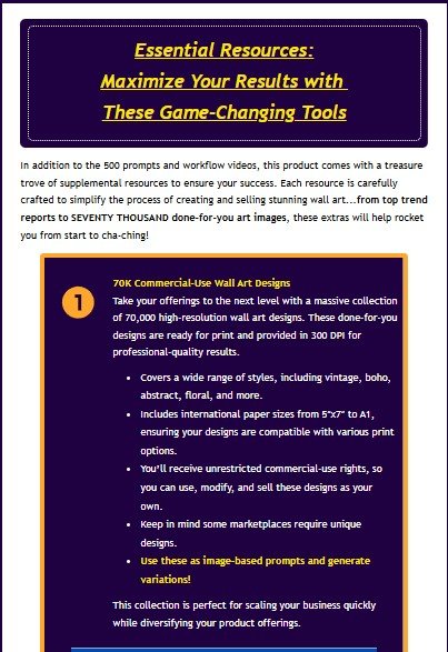 You’ll get everything you need—from expertly crafted prompts and step-by-step video tutorials to trend insights and resources—to create, sell, and build a profitable, scalable business in the booming wall art market. This product isn’t just a guide. It’s not just high-quality prompts or video training.