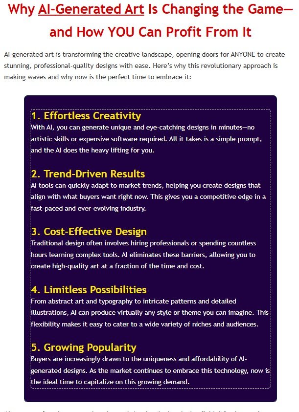 This is your chance to turn AI-generated art into a profitable online business. With my done-for-you AI prompts, you can start creating high-demand art today—without any guesswork!