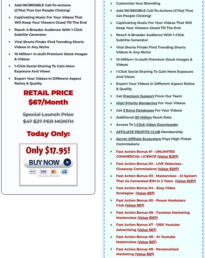 | Front End – VidEmpire AI | $17 (One-Time) | https://www.vidempireai.com/salespage-preview | • 3 Video Creation Modes (Easy, Advanced, Hyper) • 1-Click Script Generator • AI Image Generator for Shorts/Reels • Human-Like AI Voiceovers (200+ Voices) • Drag-and-Drop Editor • Custom Branding (Logo/Watermark) • CTA Buttons, Arrows, Social Buttons • Built-in Music Library • 1-Click Subtitle Generator • Viral Shorts Finder • 10 Million+ Stock Images/Videos • 1-Click Social Sharing • Export in All Aspect Ratios |