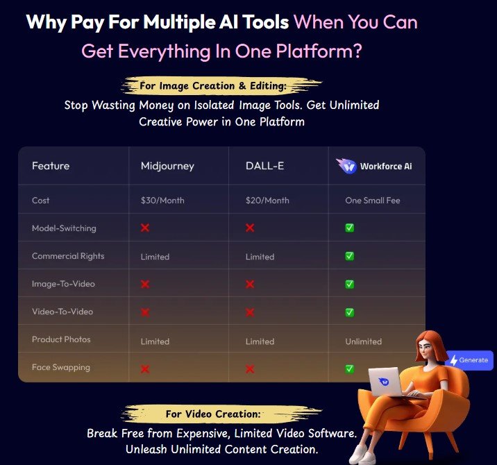 Unlike competitors that focus on one type of AI content, WorkForce AI provides a full suite of text, image, video, and automation tools.